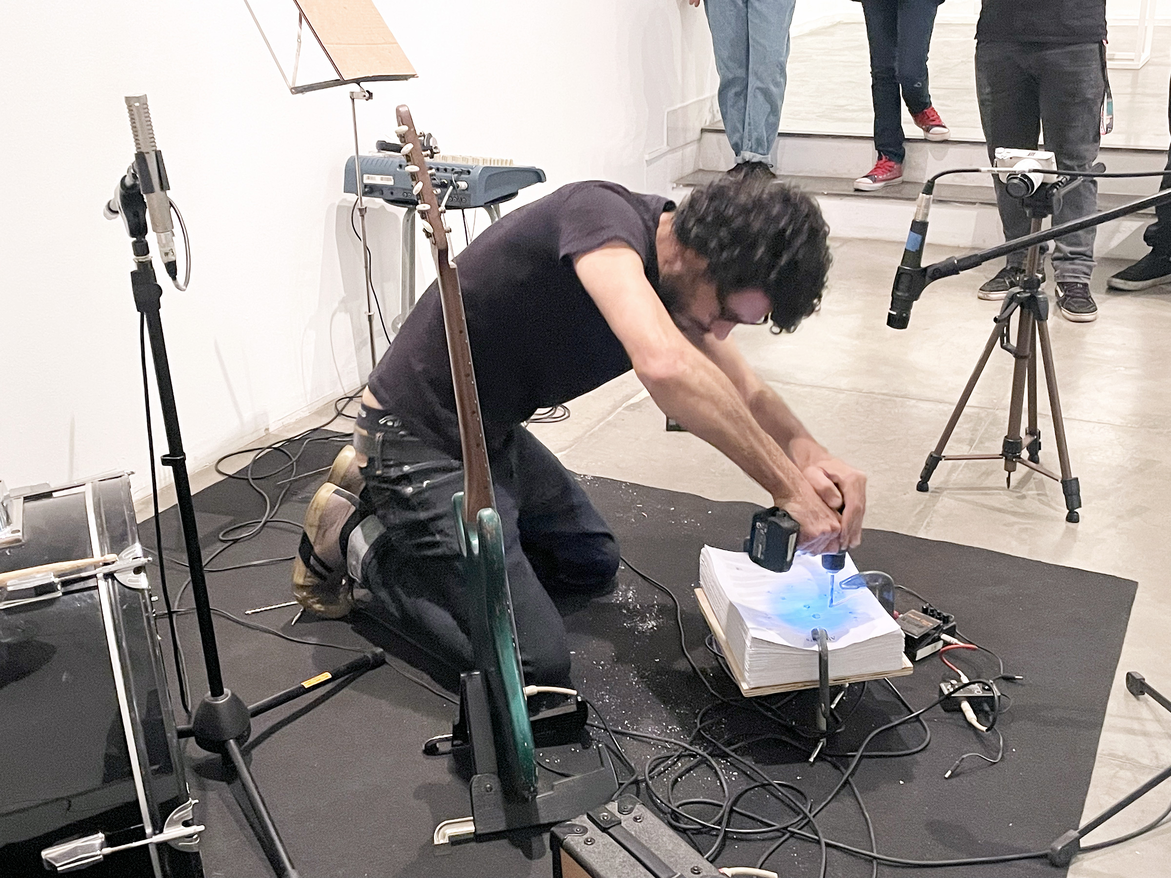 Abertura apresenta uma pilha de partituras com círculos impressos sobre a pauta que indicam o local para realização de perfurações. Nesta versão a partitura foi perfurada com uma furadeira durante uma ação sonora, que logo após esta operação as duas primeiras folhas do topo foram retiradas da pilha e colocas em uma estante de partitura, as demais tiveram rumos diversos.