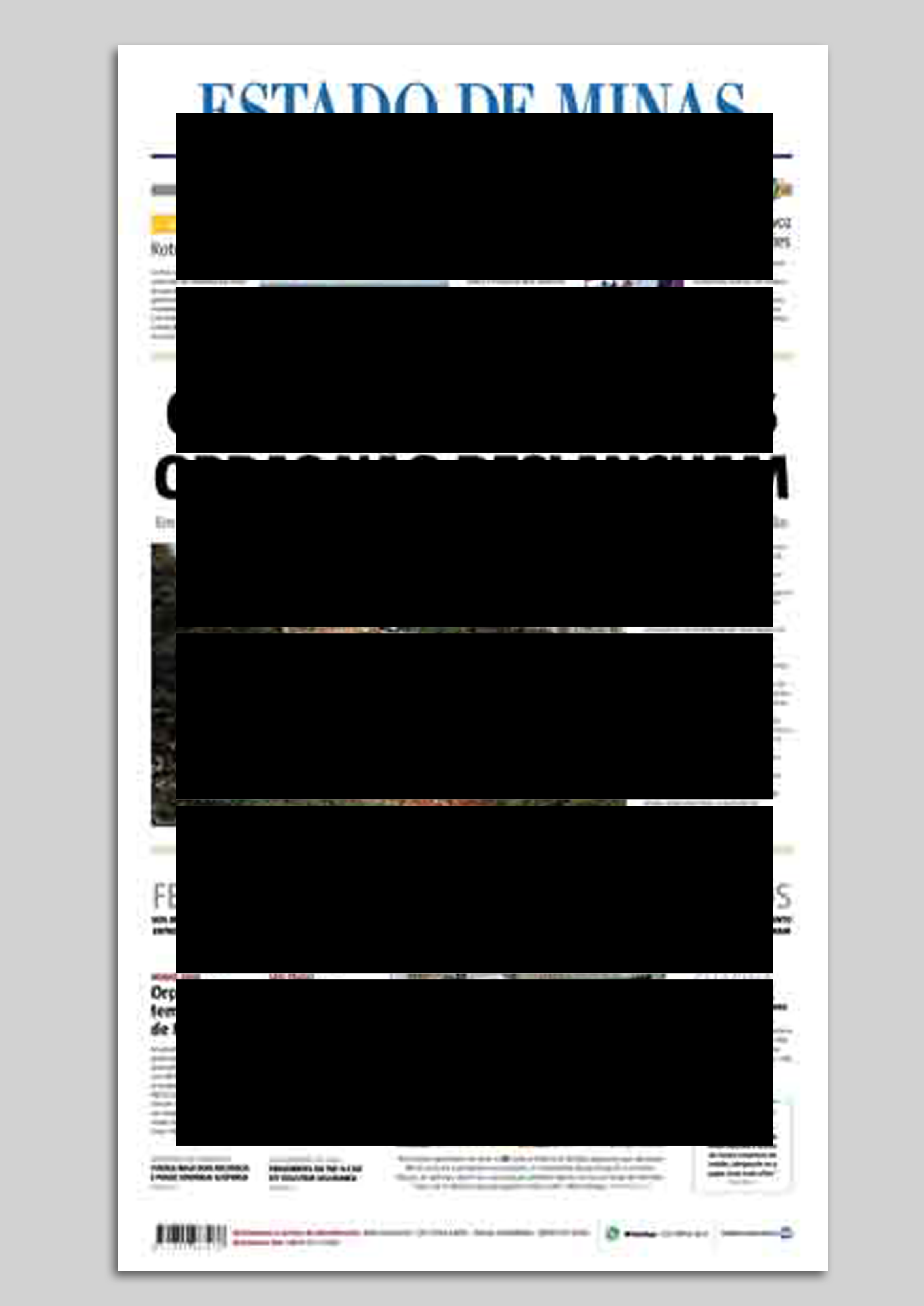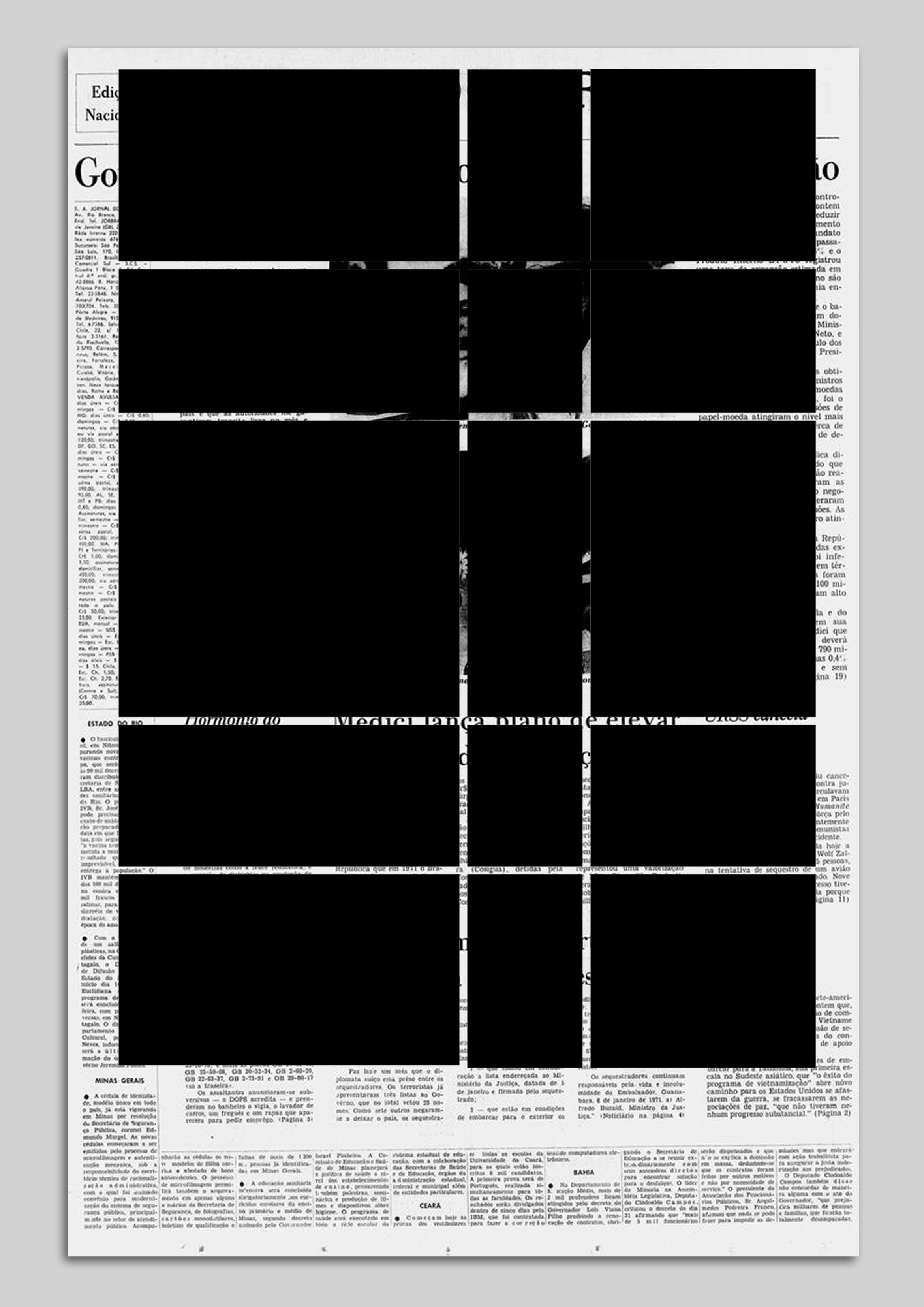 Blocked News interfere com blocos gráficos estruturados em grids sobre a primeira página de jornais de várias cidades.