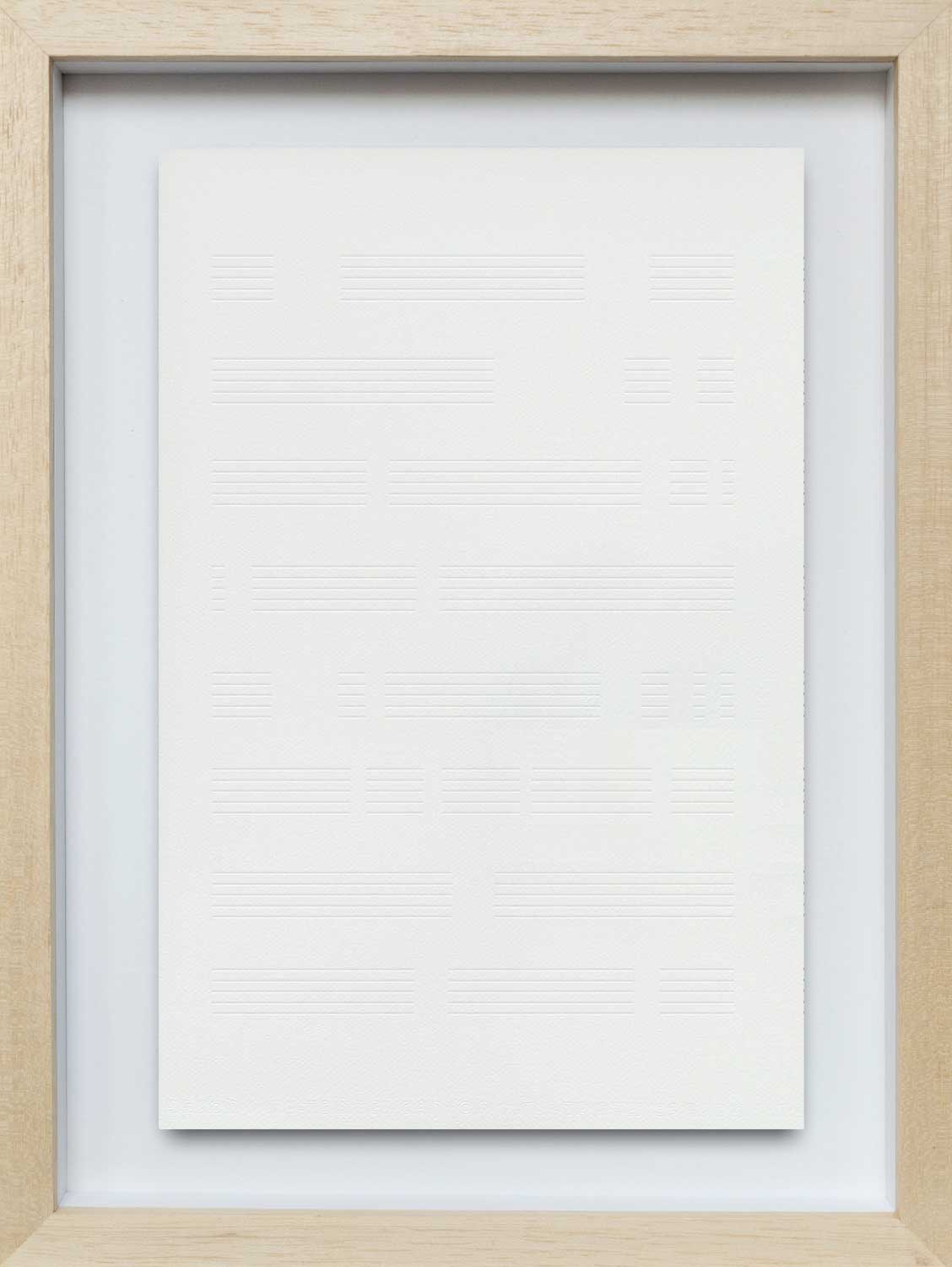 O trabalho apresenta uma partitura na qual as cinco linhas da pauta musical são grafadas a seco em tipografia sobre um papel de algodão. Nesta partitura não há notas musicais. Os intervalos em “branco” (sem relevo) desta pauta fazem a relação entre a duração das notas dando a ideia de uma composição rítmica.