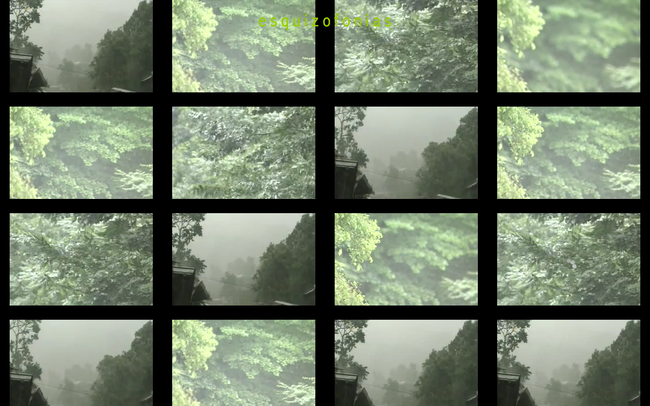 Esquizofonias apresenta 7 peças sonoras híbridas, criadas a partir de vídeos do Youtube. Os videos foram elegidos pelas suas características sonoras e são vizualizados ao mesmo tempo para criar uma mistura sonora caótica, combinações improváveis e composições musicais provisórias. “Esquizo” é uma palavra que significa dissociação, discordância e ruptura, utilizada aqui como prefixo para referir-se a uma orquestra polifônica com distintos atores e diversos timbres. As peças sonoras são criadas quando o navegador tenta (e falha) carregar todos os vídeos simultaneamente gerando assincronia. A cada três minutos uma nova série dessas esquizofonias é carregada.